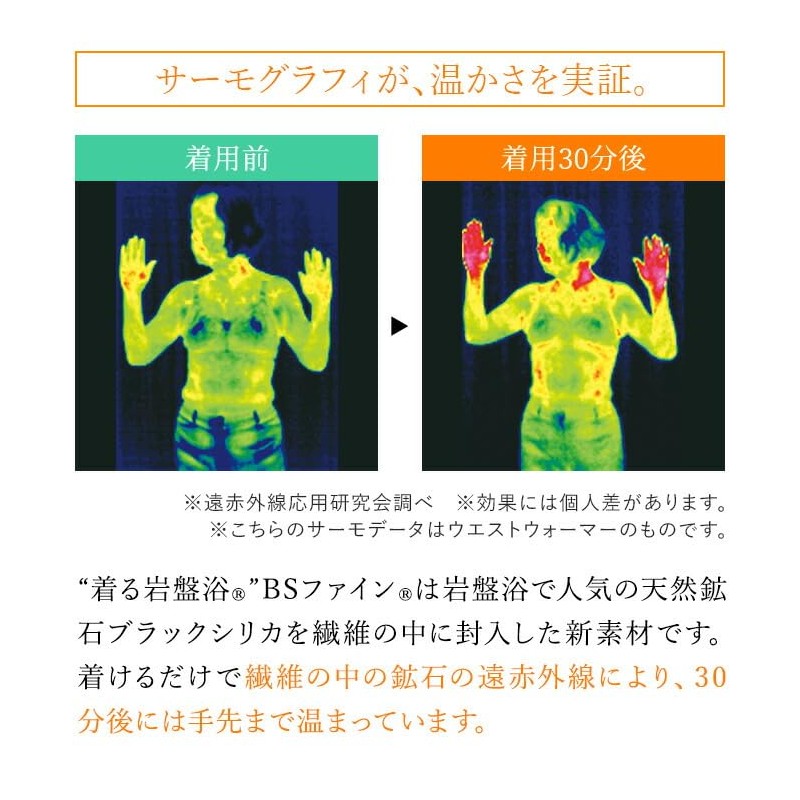 - "Wearable Rock Bath" BS Fine is a functional material that uses natural mineral black silica that is popular in rock baths. Just put it on and warm your body. The fabric does not generate heat, so it will not get hot than your body temperature. Comfortable to keep you cool and warm as it keeps you comfortable against cold or hot Comfortable all year round. The effectiveness will not change after washing