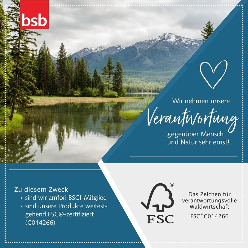 - FSC certified – we take our responsibility towards people and nature very seriously. We are an amfori BSCI member and our products are largely FSC certified (FSC C014266).