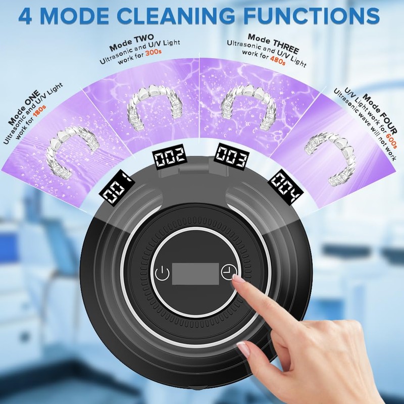 - 4 Adjustable Cleaning Modes: Tailor your cleaning experience with the four adjustable modes designed specifically for various items such as dentures, mouthguards, and night guards, making it as a versatile denture cleaner for all your needs. Mode 1:Ultrasonic and U-V Light work for 180s; Mode 2:Ultrasonic and U-V Light work for 300s; Mode 3:Ultrasonic and U-V Light work for 480s; Mode 4:U-V Light work for 600s, Ultrasonic wave will not work(no vibration will be generated)