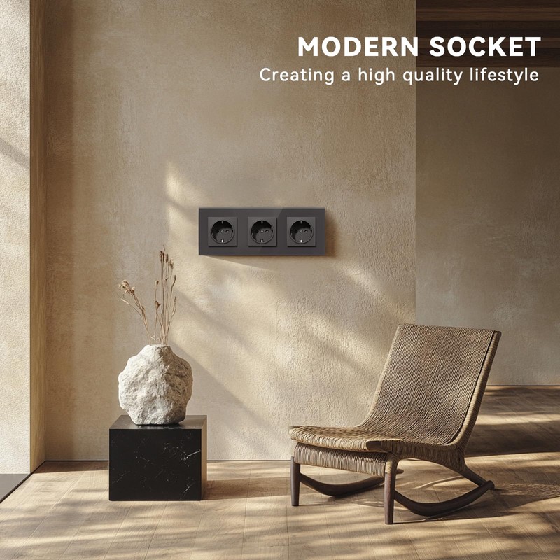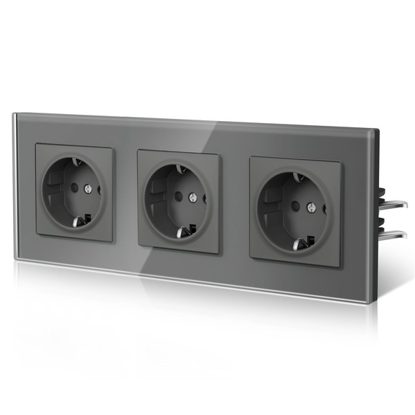 BSEED Glass Socket, EU Standard Wall Socket with Claws, Built-in Socket with Child Lock, Easy to Install, New E Series, 16 A 250 V, 3 Compartments, 228 mm, Grey