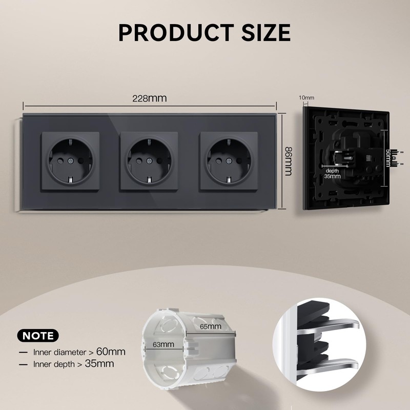 - Application standard: 16A, 250V. Our sockets can be installed in 60 mm wall sockets, which must be at least 35 mm deep.