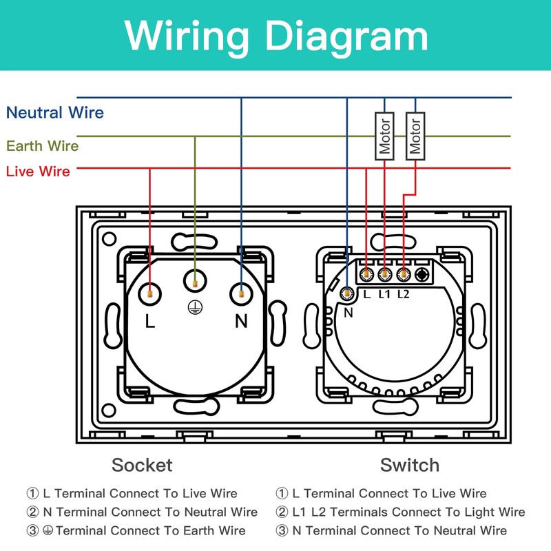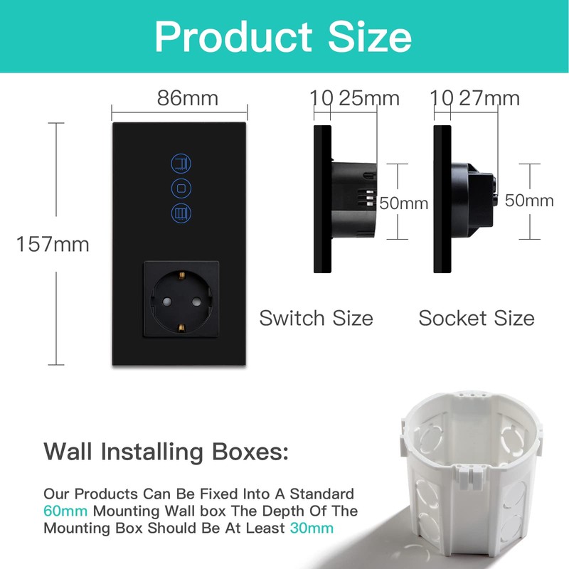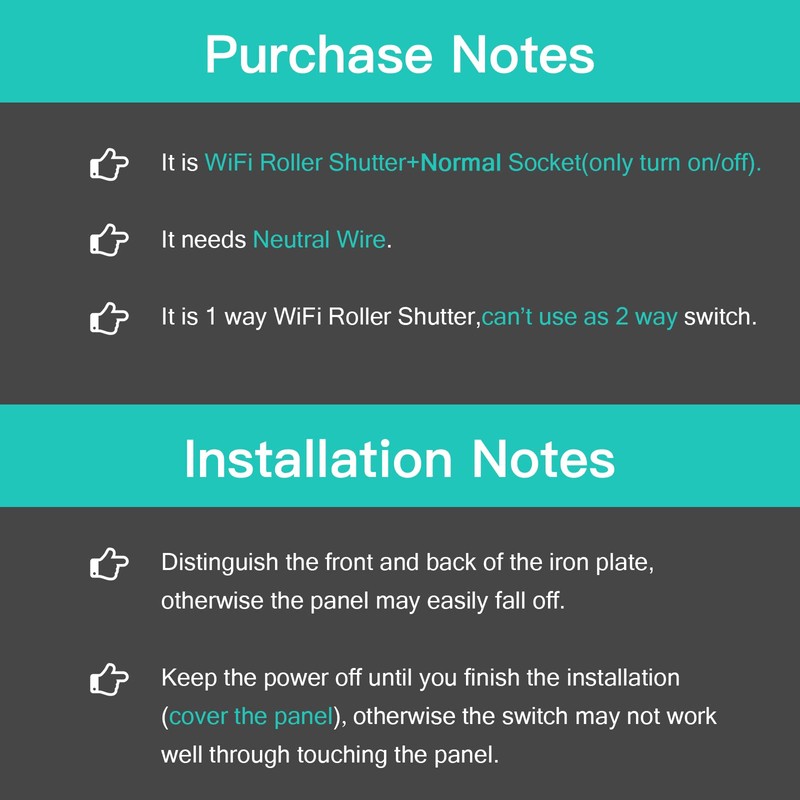 - Specification: 1x 1 way WiFi roller shutter switch + ☀ normal EU double socket. This switch is only suitable for controlling the opening or closing of roller shutters and blinds.
