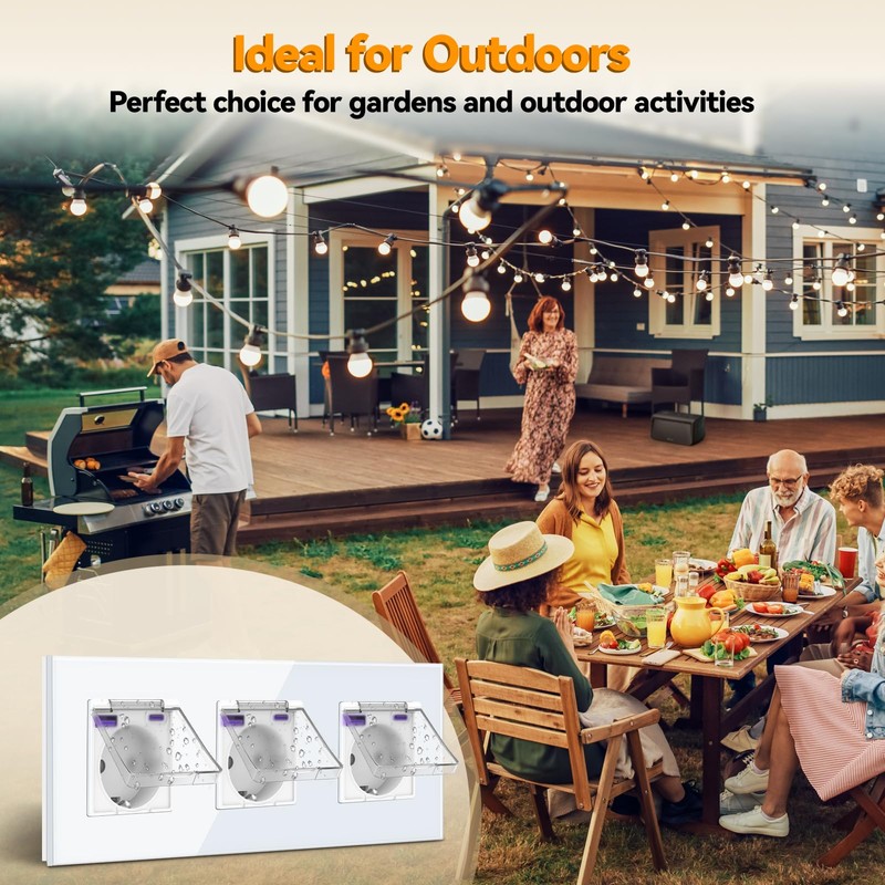 - Waterproof and robust: This socket is equipped with a water protection, which is ideal for damp environments such as bathrooms, kitchens or outdoor areas. The cover reliably protects against water and dust.