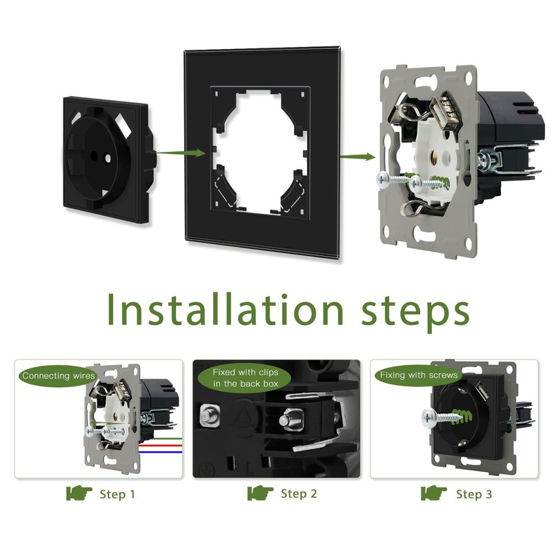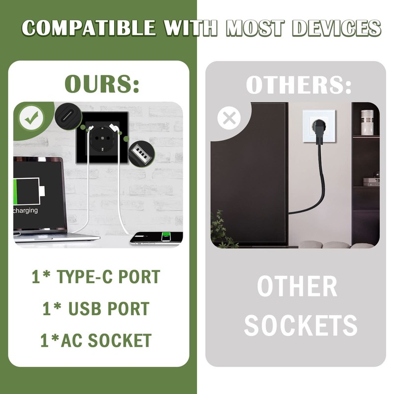 • Superior quality: The USB-C socket is made of flame-retardant ABS and waterproof touch panel made of hardened crystal. Each socket with a USB-C port is strictly tested by quality control. It still guarantees use after thousands of plugging in and unplugging.