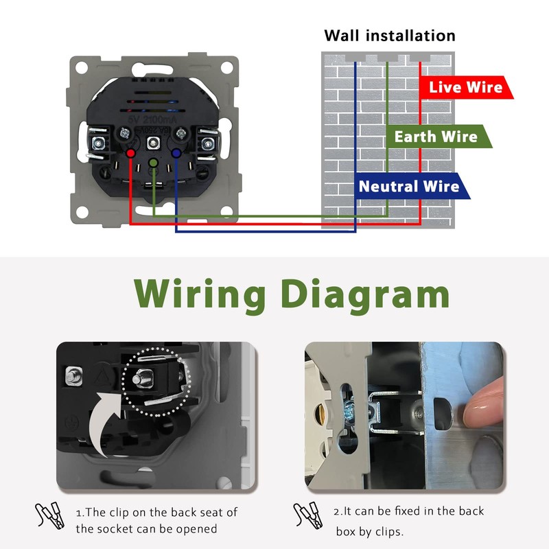 • Easy installation: Please connect the phase wire (sign 'L'), the neutral (sign 'N') and the earth (sign '〨') to install the socket. The base is attached to the wall with the help of brackets without having to drill holes.