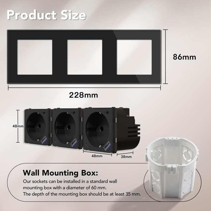 - Safety and durability: This Schuko socket with USB is made of fireproof materials that ensure high safety. The sturdy glass frame is scratch resistant and water resistant, which increases durability and makes it ideal for everyday use.