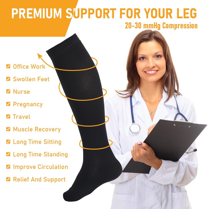 - Targeted 20-30 mmHg Compression Socks Technology: The BSERA compression socks feature 20-30 mmHg graduated compression, designed to promote leg's blood circulation. This targeted compression starts strongest at the ankle and gradually decreases up the leg, reducing swelling, alleviate the discomfort of sore aching tired legs, varicose veins, lymphedema, spider veins, surgery recovery, edema, DVT blood, clots and other circulatory issues.