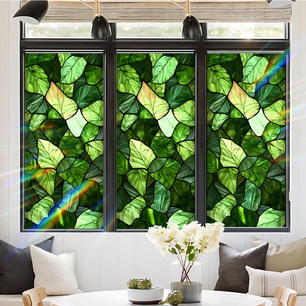 BSFHH Window Privacy Film Static Cling Stained Glass Design Sun Blocking Non-Adhesive Removable Cover for Home Office 17.5x39.3 Inches (Leaves, 39.3" L x 17.5" W)