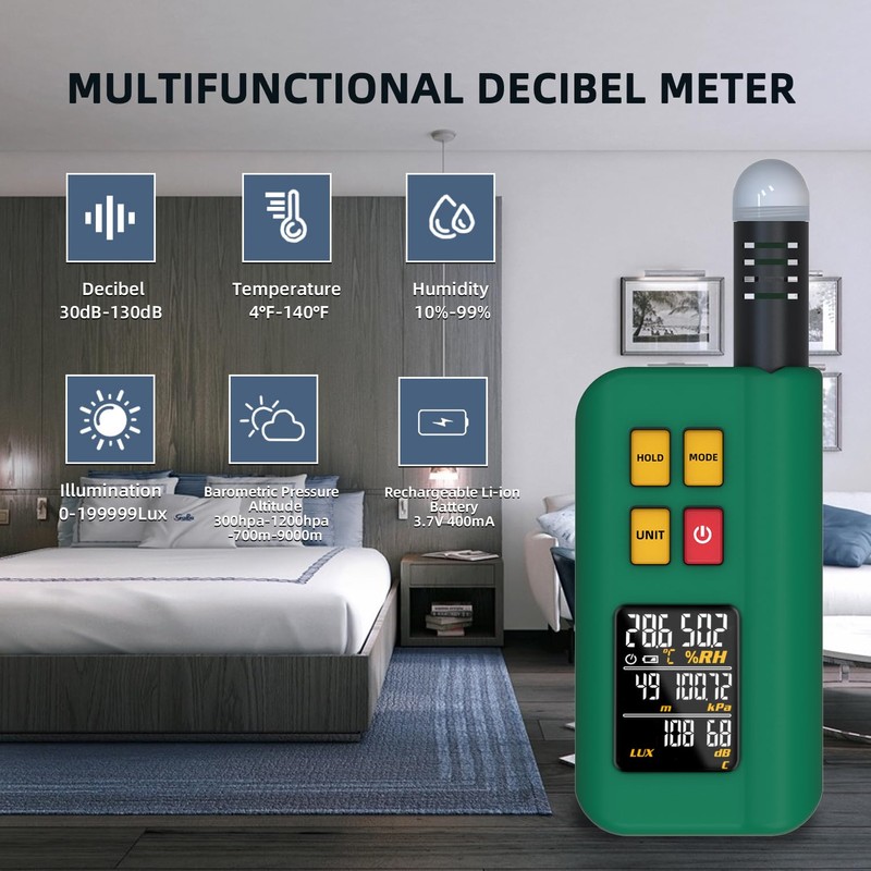 - [Multifunction]: Measures ambient temperature and humidity, lighting (0-200,000 lux), sound level, air pressure and altitude, and displays these six values on the same screen.