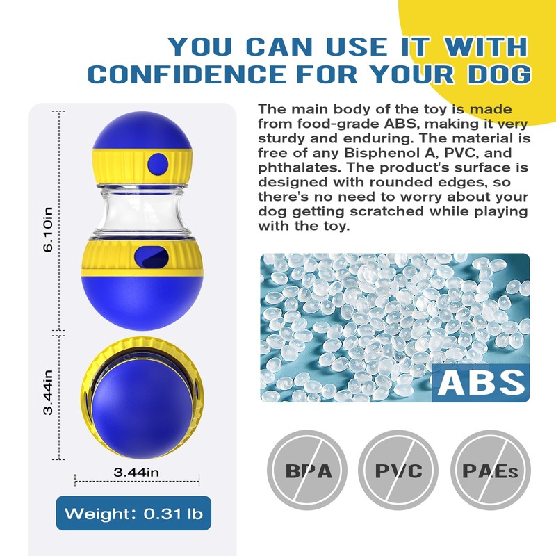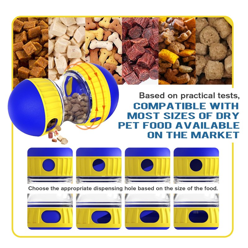 • [Treat Distribution] Our food slow dispenser has differently sized spheres at both ends. As dogs push the toy, it moves within a fixed area, allowing dogs to continuously chase and play with it. During movement, food is dispensed from the food holes on both sides of the toy.