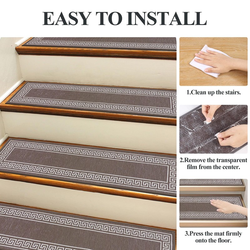 Easy Install and Removal: First clean and dry the floor, then peel off the clear film on the back of the non slip carpet stair Treads and simply press the stair treads onto the floor. If it needs to be re-laid, just peel it off, there is no residue and it can be used multiple times.