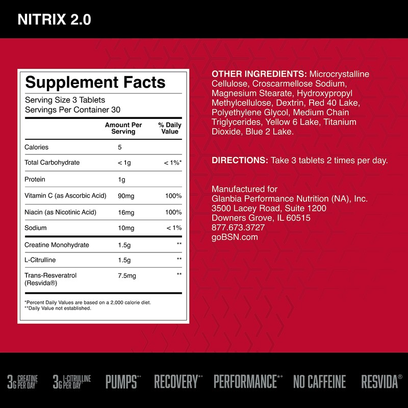 BSN BSN NITRIX 2.0 - Nitric Oxide Precursors, 3g Creatine, 3g L Citrulline - Supports Workout Performance, Pumps, Muscle Recovery and Endurance - 90 Tablets