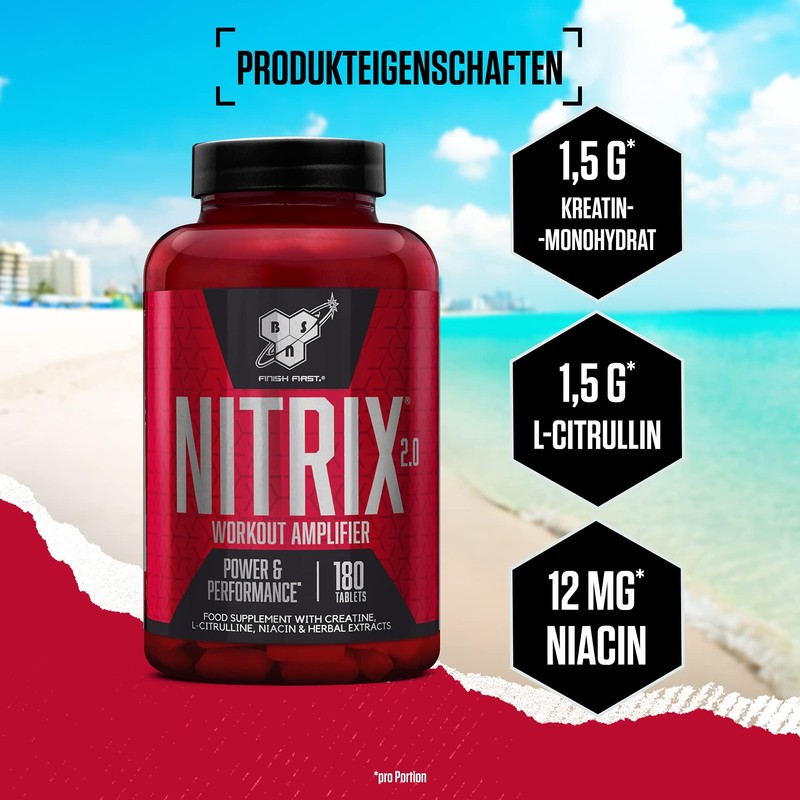 BSN Nitrix 2.0, Dietary Supplement with Creatine Monohydrate, L-Citrulline, Niacin, Black Pepper and Herbal Extract for Performance Increasing, Unflavoured, 60 Servings, 180 Capsules