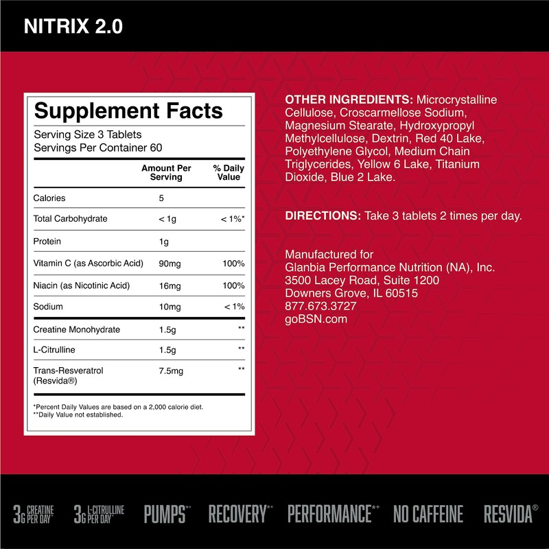 BSN NITRIX 2.0 - Nitric Oxide Precursors, 3g Creatine, 3g L Citrulline - Supports Workout Performance, Pumps, Muscle Recovery and Endurance - 180 Tablets (1049682)