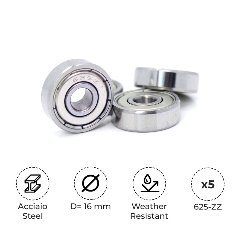 - 5 x 625-ZZ ball bearings made of durable and quiet steel.