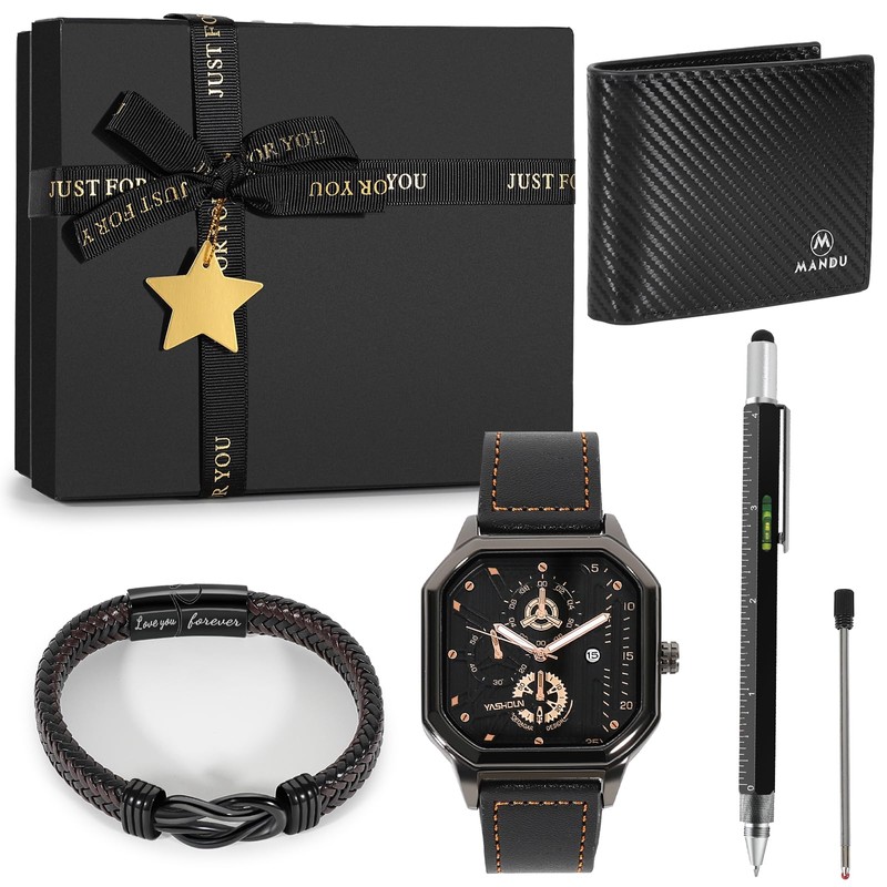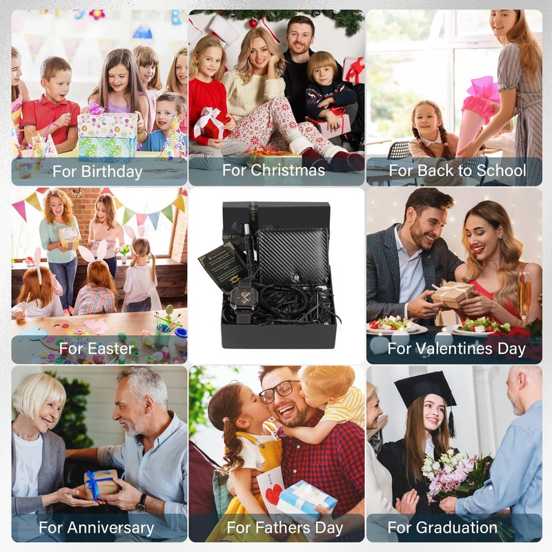 - Gifts For Men:The man gifts set comes with 1*men's fashion watch,1*RFID wallets,1* fashion Bracelets,1*6-in-1 Multitool Pen, 1*Greeting Card,1*black gift box for menEverything is housed in a black elegant gift box.suitable for every man, father, husband, boyfriend, brother, yourself, son, boss, subordinates, etc. It is the best gift choice for Birthday, Anniversary, Father's day, Thanksgiving, Valentine's day,Christmas and so on.When he receive the mens gifts he will deeply feel your love!This men gift set is a wonderful gift to satisfy your giving gift needs and the practical man gifts set will make him happy and heat- warming.