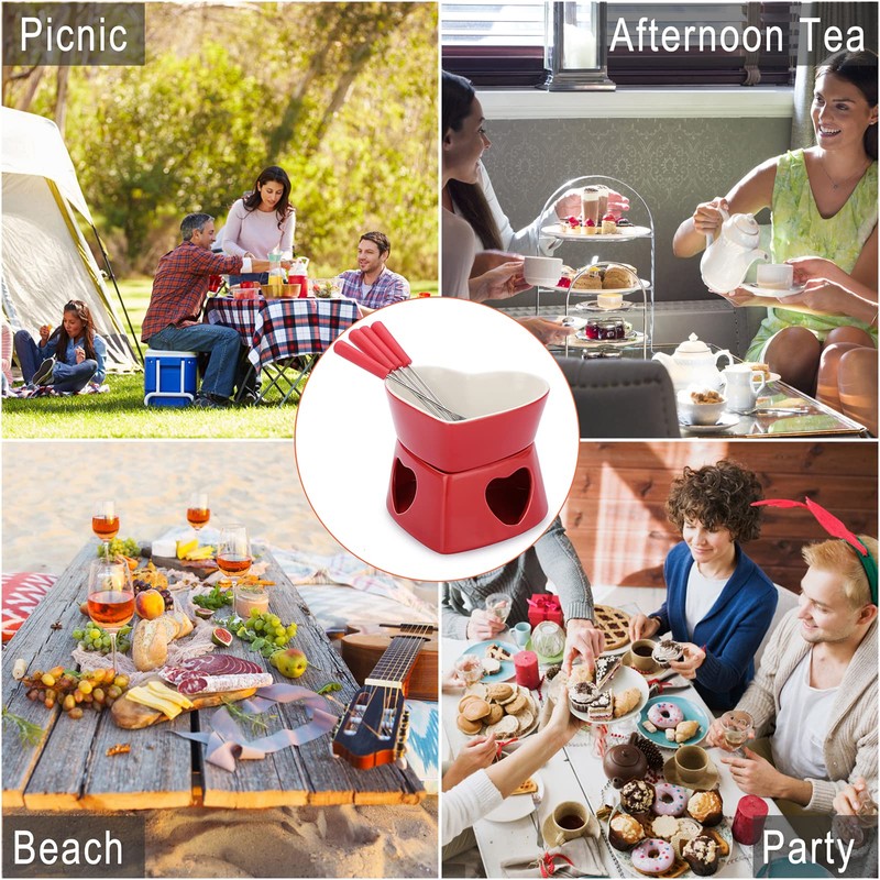 - 🍲ADAPTABLE TO MANY OCCASIONS - This fondue set is perfect for picnics, afternoon tea, beaches, gatherings, buffets and party tables. Make delicious dips and enjoy with your favorite fruits, vegetables, cookies, treats, marshmallows, mini cupcakes and more.This fondue sets is your go-to for showcasing any type of food, other desserts or appetizers.