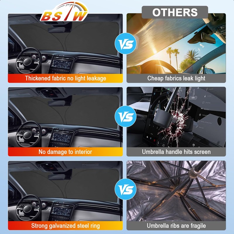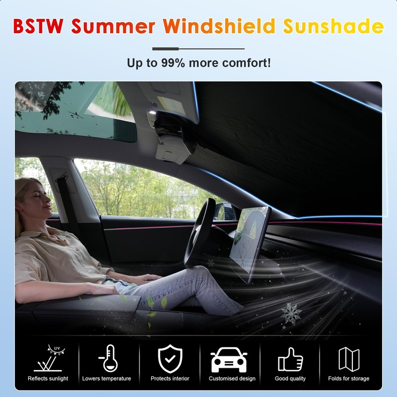 The BSTW sun shade can significantly reduce the temperature in the car, reduce the load on the air conditioning, save electricity and fuel and make travel more economical and environmentally friendly