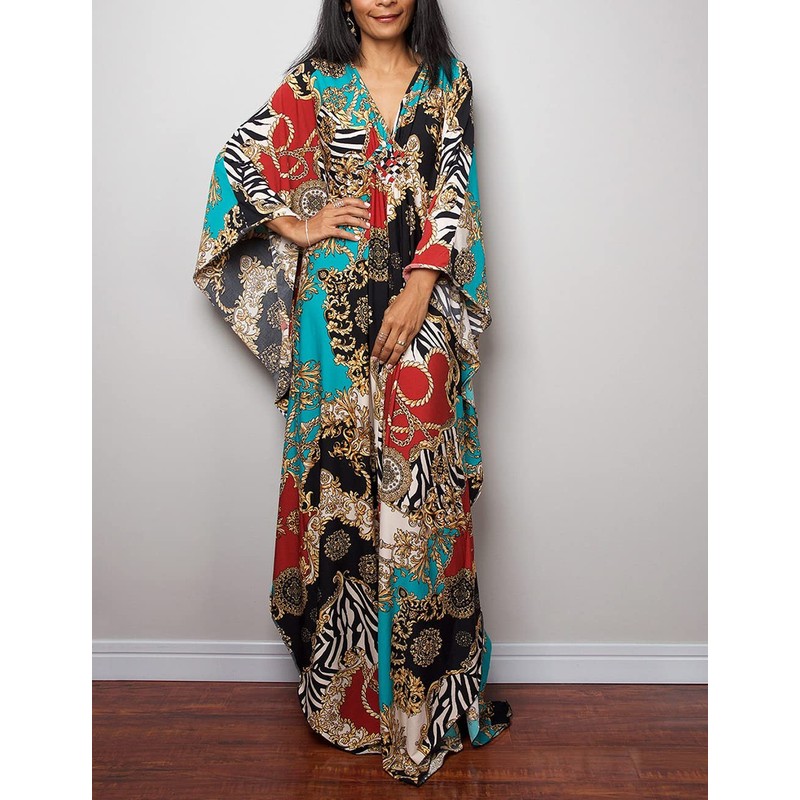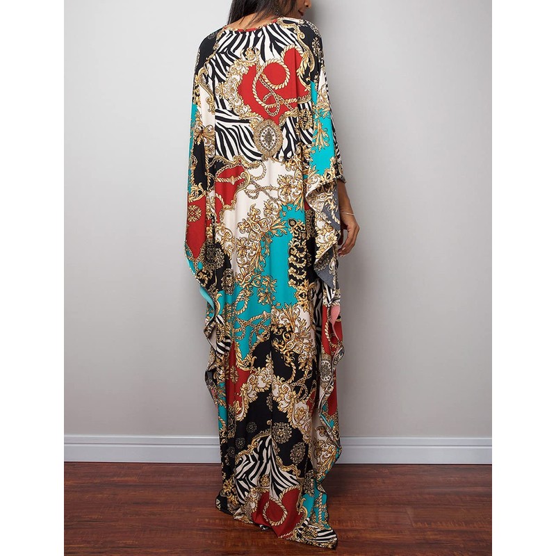 Bsubseach Women's Ethnic Print Kaftan Beach Dress Plus Size Beach Dress, F-blue red chain
