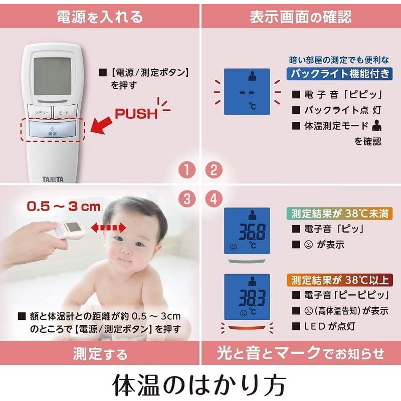 - 洋服を着たまま、おでこで測定できる非接触体温計。寝ている子供や、動いてしまう赤ちゃんなどの体温もわずか1秒で測定できるので、測定時の負担が軽減できます。バックライト付きなので、暗い部屋でも電気をつけずに数値が確認できます。