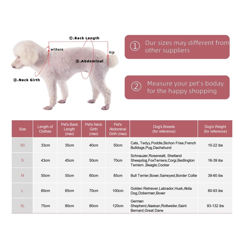 Total 5 sizes, suitable for small, medium and large dogs. Please make sure to measure your dog carefully before choosing the size. If your pet's measurement is between sizes, please choose the larger size.