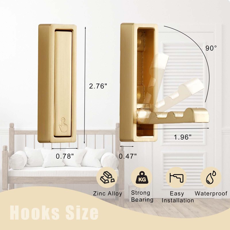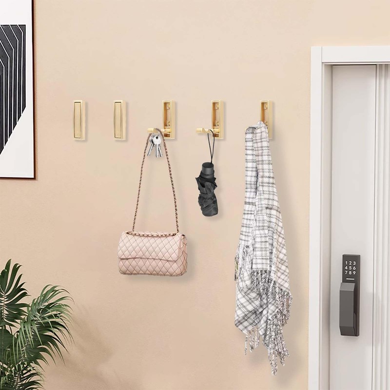- Hidden Folding Hook: These gold folding hooks adopts innovative folding hook storage design, which is easy to open, saves space, and prevent injury from collision. When not in use, the hook can be hidden, making the wall both simple and beautiful. When in use, simply press then it will be opened easily.
