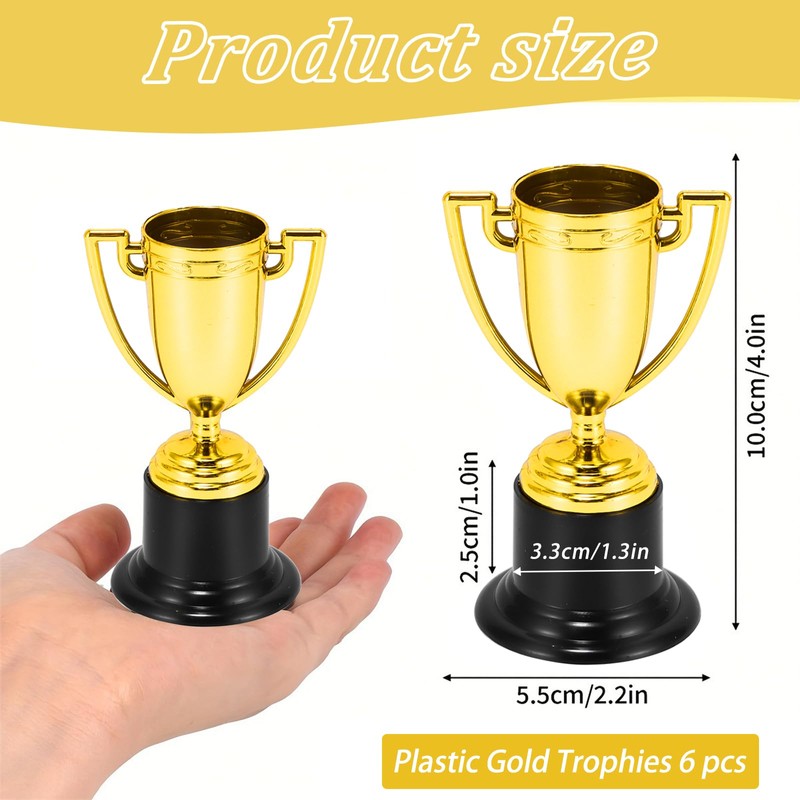 - 🏆【Winner Trophy Size】6Pcs Plastic Reward Trophies Kids Prize Cups School Rewarding Supplies. The size of the mini trophy is about 6 X 4.8X 9.5 cm. Good size, plenty, and easy to play. Suitable for parties, indoor and outdoor activities, classroom rewards and more.