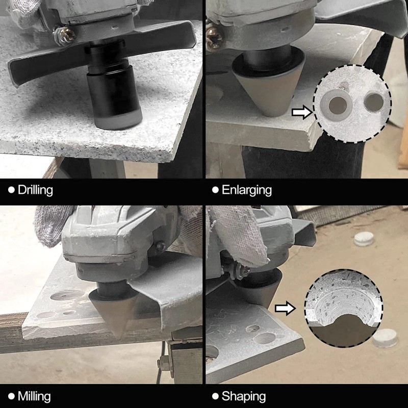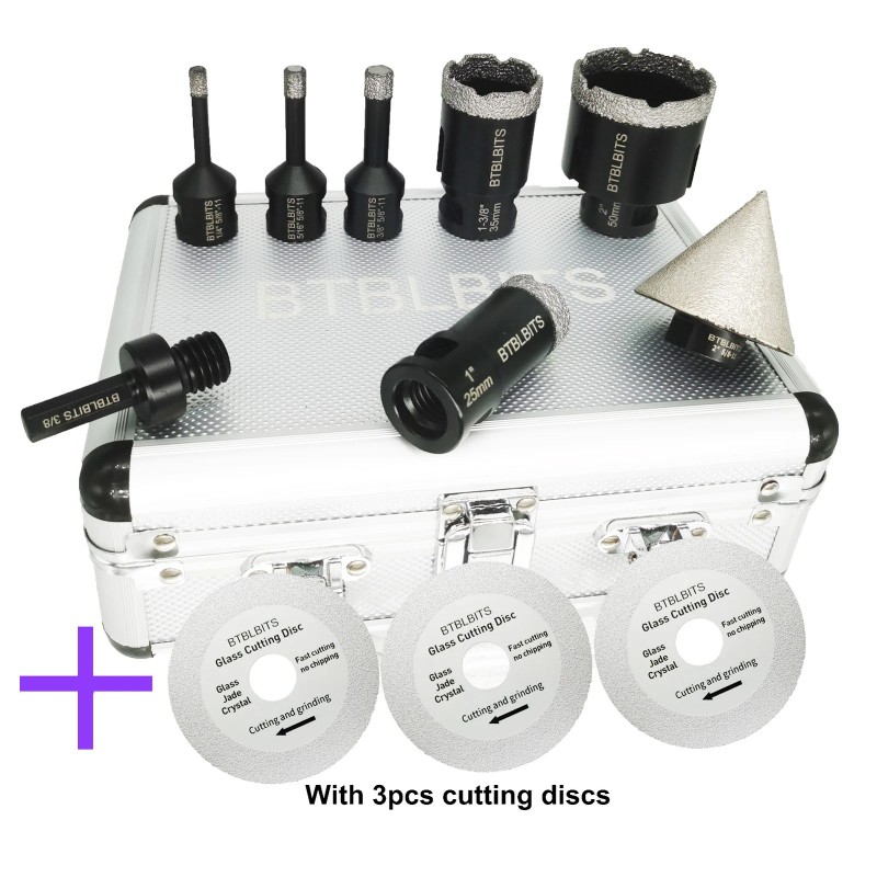 Package Content:11pcs in total; 6pcs Diamond drill bits 1/4", 5/16", 3/8", 1", 1-3/8", 2" (6/8/10/25/35/50mm), 1pc 2" (50mm) Diamond Beveling Chamfer Bit, 1pc 5/8"-11 to 3/8" Hex Shank Adapter,3pcs 100mm (4") glass tile cutting and grinding discs