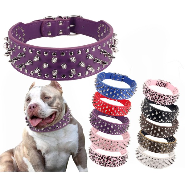 BTDCFY Hoot PU Leather Adjustable Spiked Studded Dog Collar 2" Wide 37 Spikes (M(Neck 19"-22"), Purple)