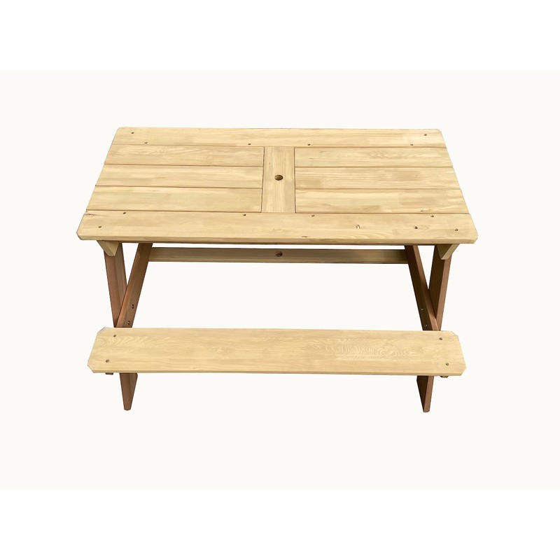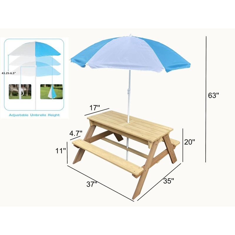 - Use this Picnic table for lunch, learning, play time. or just explore the activity tray bins in the table top for play time with 7 piece toys, sand or water. Comes with Adjustable umbrella to adjust shade. Seating for upto 4 children. Made from Solid wood which is treared lead BPA FREE wood as per safety standard. Built to last long, Ideal for any Lawn, Yard, backyard , front or outdoor play setting area.Comes with Comfortable two benches facing each other .