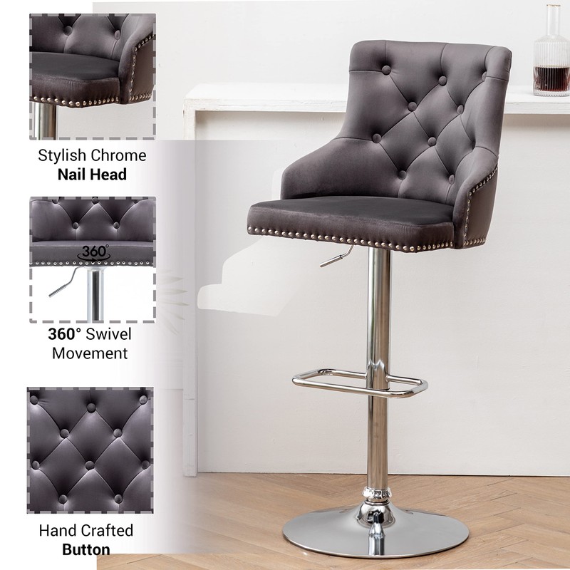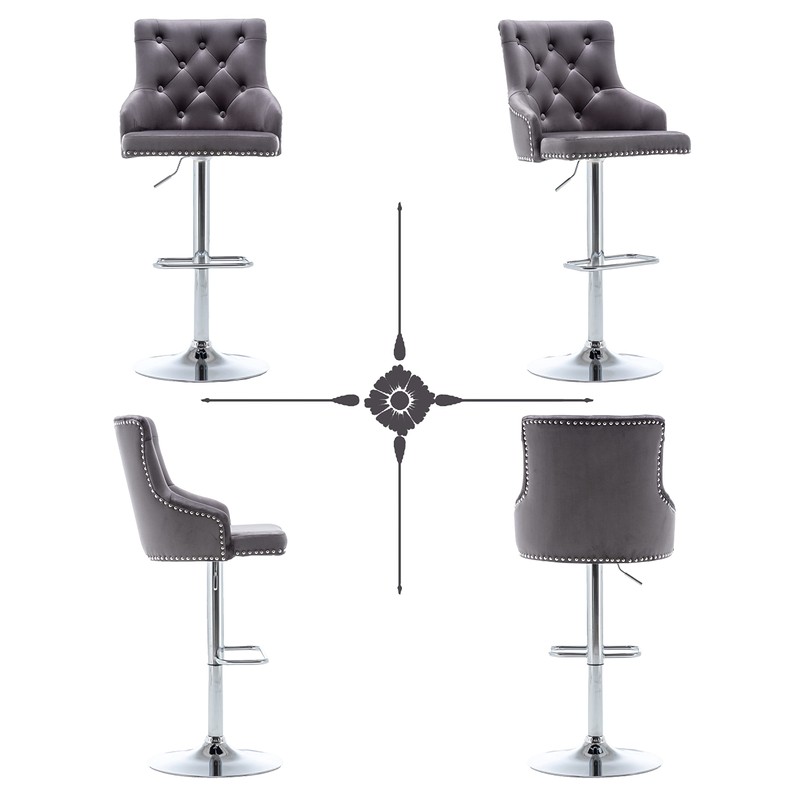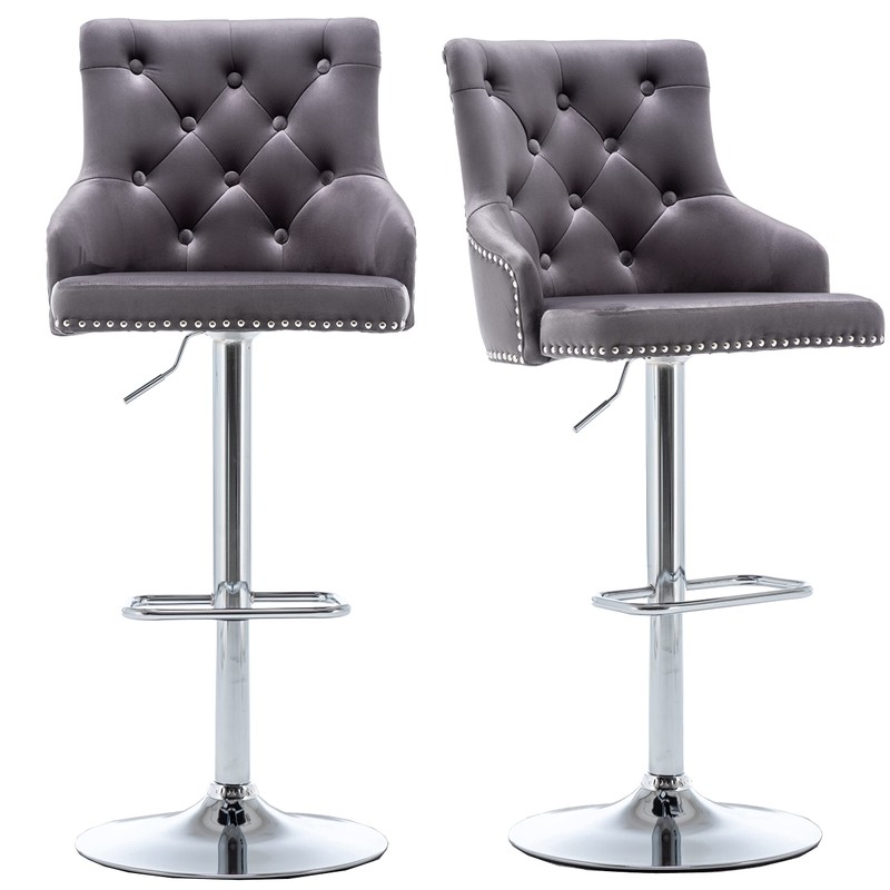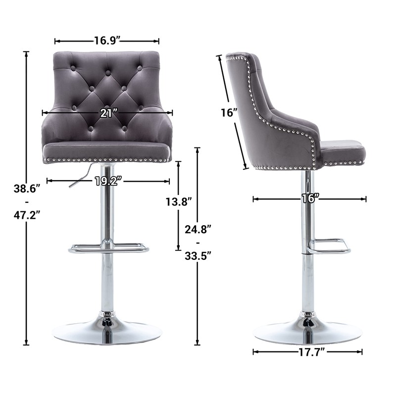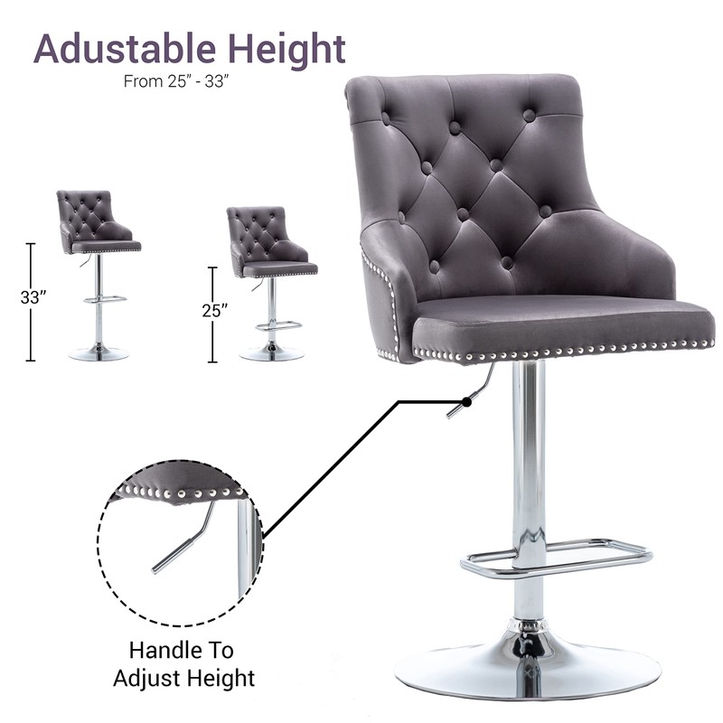 BTEXPERT Set of 2 Premium upholstered Dining 25" - 33" Adjustable High Back Stool Bar Chairs, Gray Tufted Nailhead Trim, (5153GR-2)