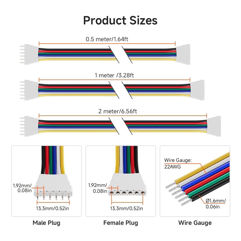 - The connector type is male to female 6-pin jst connector, wire diameter 22awg, with a cable length of approximately 1 meter/3.28 feet. The connector wire color are: black, green, red, blue, white and yellow. Please check the colors of the wires and their respective polarities before connecting to your device(s).