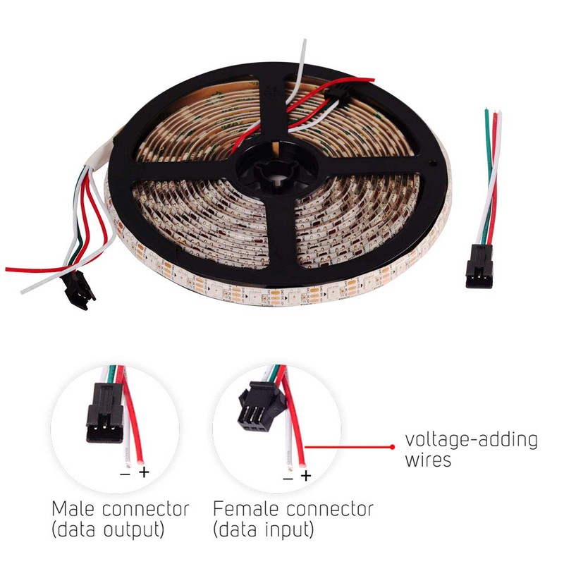 - Individually Addressable. Dream full color Programmable LED Strip,WS2812B LED, WS2812B IC Built in 5050SMD. 256 brightness display and 24-bit color display. It comes with 3pin JST-SM connectors on both ends for easy installation and separated power/ground wires on both ends. Each LED can be cut off without damaging the rest strip. You can shorten, lengthen or bend it freely if you want.