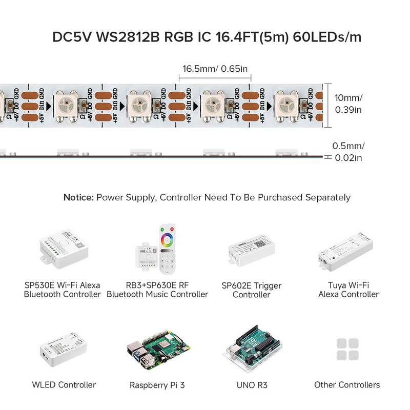 - DIY Controllers. The addressable RGB IC Chip is built-in the 5050SMD. Each pixel can have its own color and brightness as your wish. Compatible with WLED, K-1000C, Rasp Pi, UNO R3, ESP8266, ESP32 etc Programmable Controllers. Support RB3+SP630E, SP611E, SP608E, SP602E etc Bluetooth music Controllers, SP530E, WT-SP etc smart 2.4GHz Wi-Fi Alexa music controllers. Controllers requires an additional purchase.
