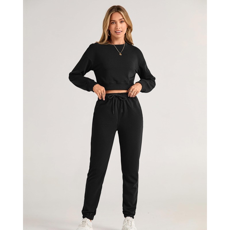 - FEATURE: Casual Two Piece Outfits For Women / Lounge Sweatsuit / Crew Neck / Long Sleeve / Ribbed Cuff / Drawstring Elastic Waist / Crop Top Pullover / Jogger Long Pants With Side Pockets / Beam Foot / Solid Color