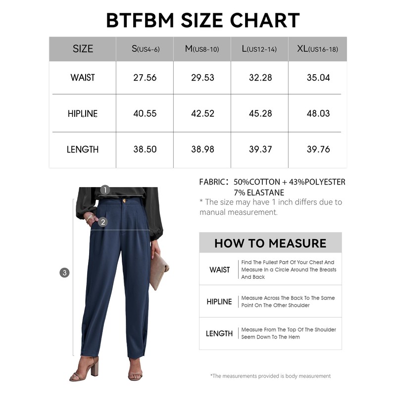 - FEATURES: S=US 4-6, M=US 8-10, L=US 12-14, XL=US 16 / Summer Women’s Pants / Womens Casual Pants / Zipper Closure / Elastic Waist In The Back / Tapered Pants / Front Pleated Design / Slanted Pockets / Decorative Button Leg Opening / Lightweight / Stretchy Soft Material