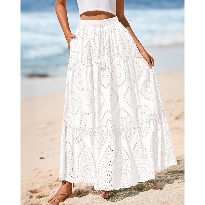 BTFBM Women's Boho Casual Skirts Summer 2025 Lace Embroidery Eyelet Elastic Waist Flowy Tiered A-Line Beach Maxi Skirt(White, Medium)