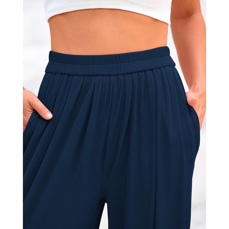 BTFBM Womens Casual Wide Leg Pants Summer Fall Clothes Pleated Elastic Waist Loose Palazzo Knit Trousers with Pockets(Navy, Medium)