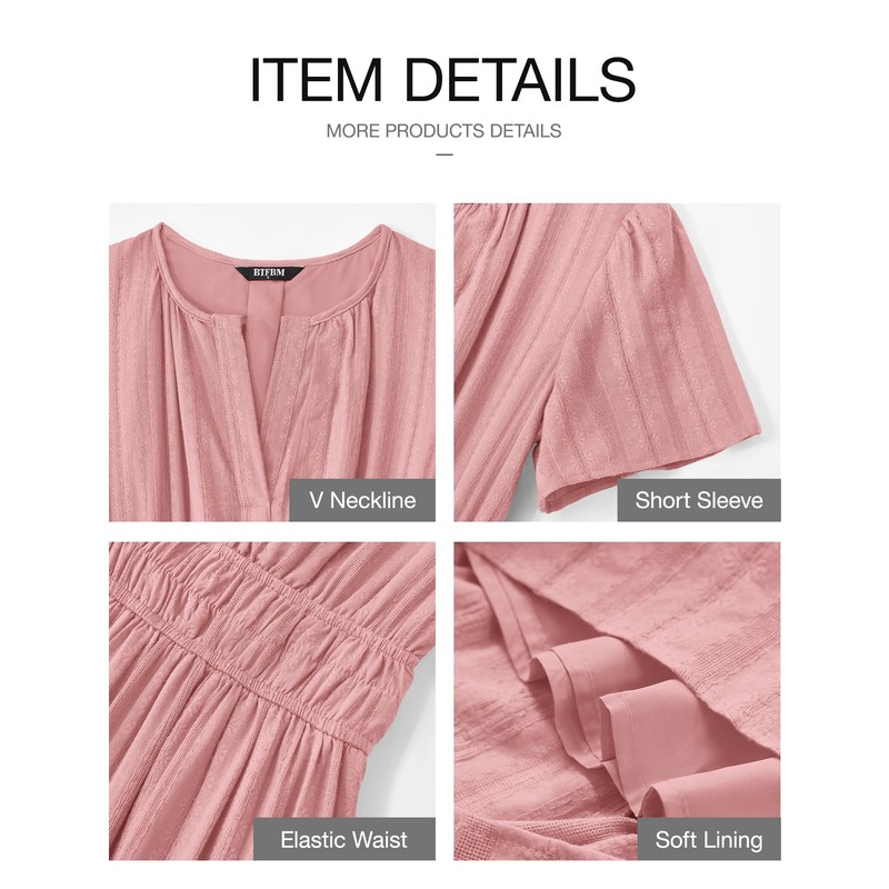 BTFBM Womens Summer 2025 Casual Midi Maxi Dresses Lightweight Short Sleeve V Neck Elastic Waist Boho Beach Dress Pockets(Bean Paste Pink, Large)