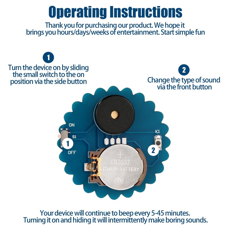 - Package list: you will receive 1 piece barbecue noisemaker, 1 battery, 1 round double-sided tape and 1 instruction manual (English language not guaranteed). It rings every 5-45 minutes, makes people crazy and is a perfect offer for pranks.