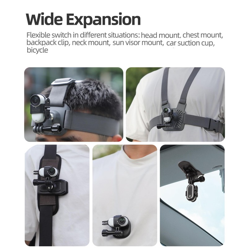 - Wide expansion, flexible switch in different situations: head mount, chest mount, backpack clip, neck mount, sun visor mount, car suction cup, bicycle, etc.