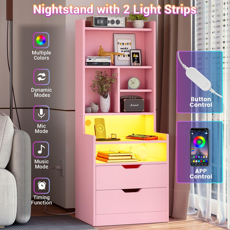 BTHFST Tall Nightstand with Charging Station & LED Lights, LED Nightstand with Drawers & Shelves, Tall Bedside Table with Bookshelf, End Side Table with Storage, Pink