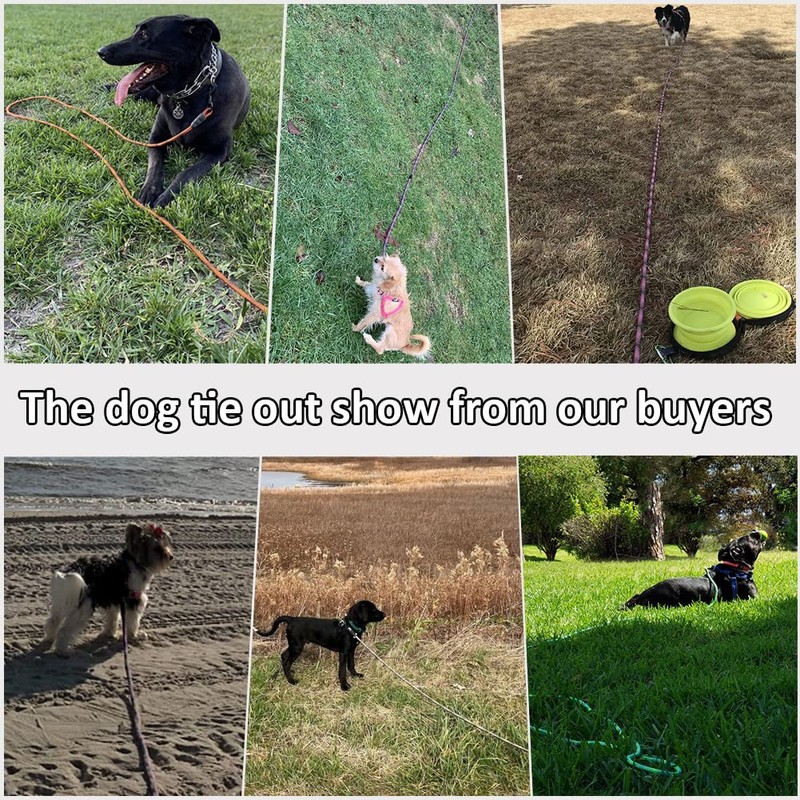 - DOG TIE-OUT: This dog tether is designed for dog tie out in the yard. Tangle free double ended clips, heavy duty and rust-proof. Tether dog to a post, tree or stake. Whether your yard has fence or not, it is a practical dog escape-proof tie-out rope