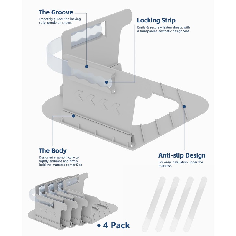 Btiztlla Bed Sheet Holders - 4 Pack Grey Lock Sheet Holder Designed to Fit All Sheet Sizes Offer Easy One-Time Bed Bedroom Accessories College Dorm Essentials