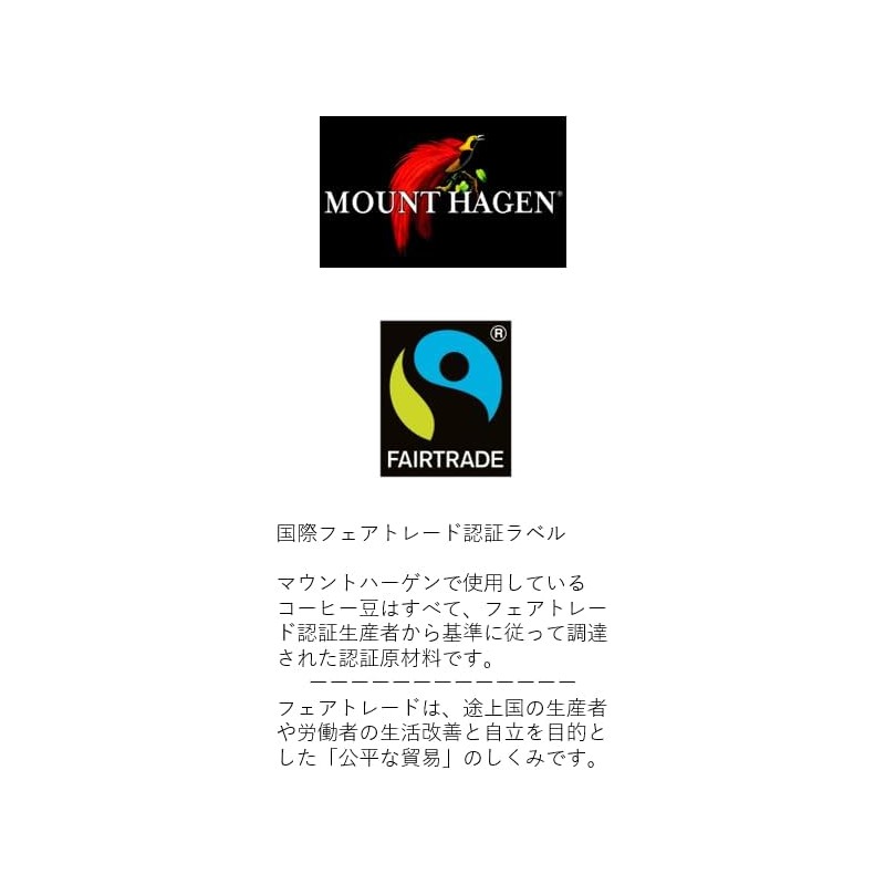 This is a 100% blend of Arabica coffee beans grown organically at high altitudes. The natural decaffeination process leaves the original deep, rich taste and aroma intact. Less than 0.3% residual caffeine. The adoption of a method of removing caffeine using only natural liquid CO2 and water (so-called supercritical carbon dioxide extraction method) patented in Europe and the United States, leaves the original deep, rich taste and aroma intact. Newly certified fair trade. MOUNT HAGEN's organic coffee, both roasted and instant coffee, uses only the finest high-altitude coffee beans that are grown using traditional organic farming methods and hand-picked. Slow and careful roasting creates a balanced, rich aroma that is original to the original beans. The latest natural techniques allow you to enjoy authentic flavors even though the coffee is freeze-dried. By using organic farming methods, even decaffeinated instant coffee can retain its original aroma, providing the double pleasure of a deep flavor and being gentle on the body. This is a blend of 100% of the highest quality Arabica beans grown organically at high altitudes with a deep, rich aroma. By adopting a method patented in Europe and the US that uses only natural liquid carbon dioxide and water to remove caffeine (the so-called supercritical carbon dioxide extraction method), we have preserved the original deep, rich flavor and aroma. Residual caffeine rate is less than 0.3%.