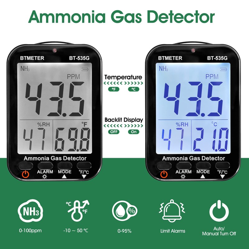 BTMETER Ammonia Gas Detector 535G, Air Quality Meter Monitor Indoor NH3 Gas 0~100 PPM, Relative Humidity and Temperature, Rechargeable Ammonia Gauge with Alarm, Backlit LCD Display