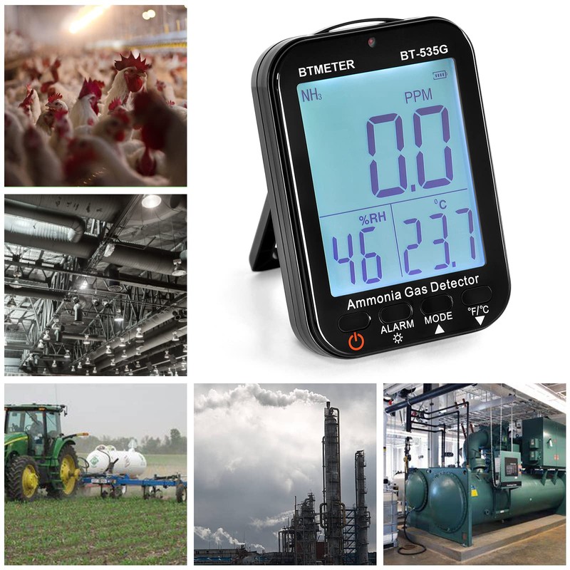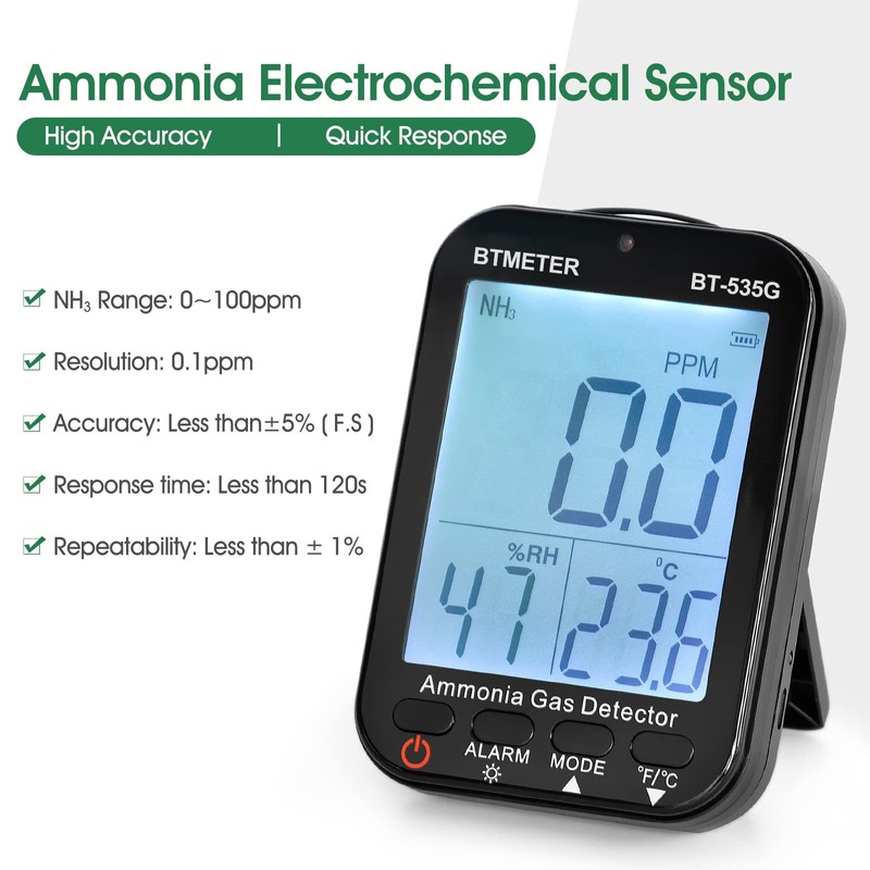 - ✅【High Accuracy】Designed with professional electrochemical sensor, BTMETER air quality tester 535G can quickly detect ammonia gas levels between 0-100 ppm with high accuracy ±5% within just 120 seconds.