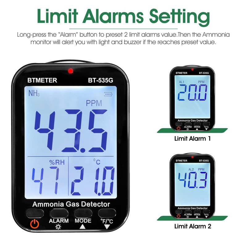 - ✅【Adjustable Alarms Setting】Equipped with ammonia alarm buzzer, this smart NH3 gas detector would help you to stay safe and monitor ammonia concentration effectively. It supports 2 NH3 gas alarms value setting and it would alert you with beep sound and LED light if the measured value reaches the preset limit.