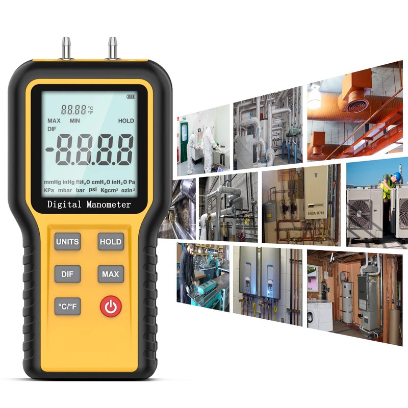- ✅【Easy to Use】12 gas pressure unit options (mmHg, inHg, ftH₂O, cmH₂O, inH₂O, Pa, KPa, mbar, bar, psi, Kgcm² and ozin²) , 3 measure modes(Max, Min, differential DIF) and 5 buttons simple operation design, help you to get use of this 200g portable differential pressure monitor easily.
