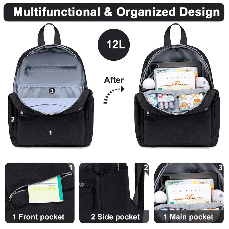 - The small teens backpack size is approx H 13inch * L 11inch * W 5.1inch,1*main pocket with one ipad compartment and one zipper pocket, 1*front zipper pocket for small items, Two side pockets for your water bottle, perfect for womens and girls for day trips, vacation, travel, day hikes, school, camping and shopping.